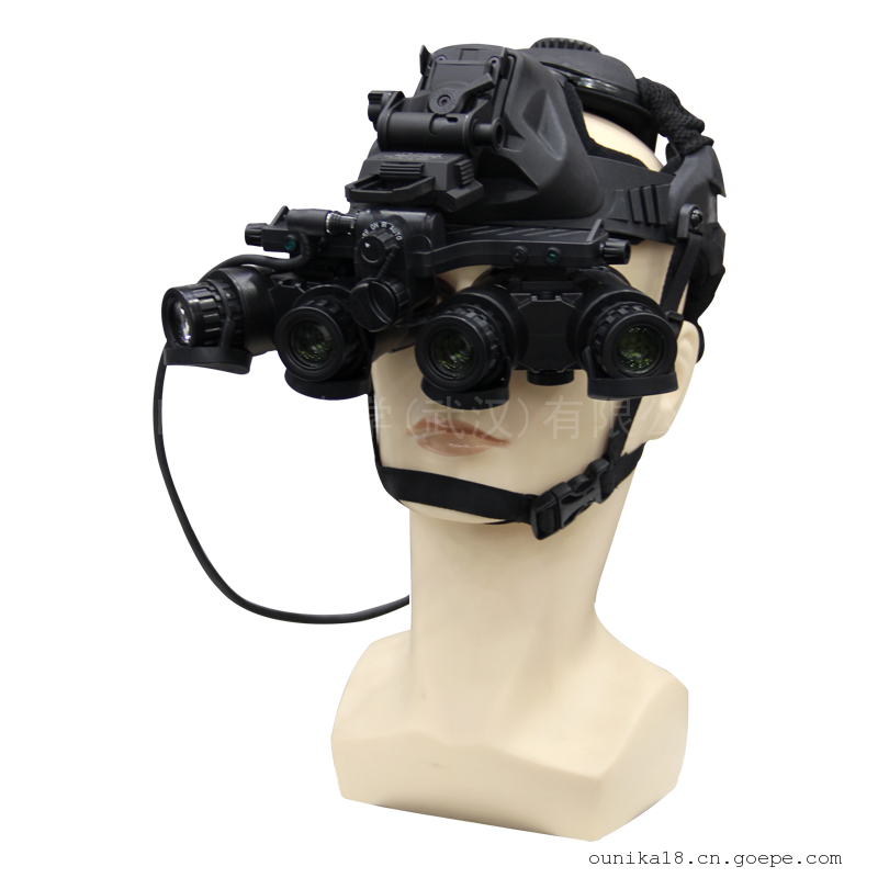 欧尼卡Onick NVG-D4多功能微光夜视仪采用了高性能准三代像增强器,具有性能优良、体积小、重量轻、成像清晰、操作简单,使用灵活,存在四个独立的图像增强管,四个独立的物镜在全景方向上排列。中间的两个镜头像传统的双管护目镜一样向前指向,给操作者更多的深度感知,而另外两个镜头从中心稍微向外指向,以增加周边视野。右边的两根管和左边的两根管在目镜处拼接。操作员看到两个中心管与两个外管有些重叠,产生了前所未有的120°视场角度。