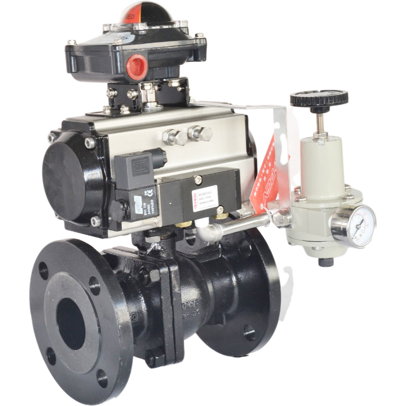 铸钢气动球阀具有旋转的90度动作,球有圆形通孔通过轴线,当球旋转90度时,