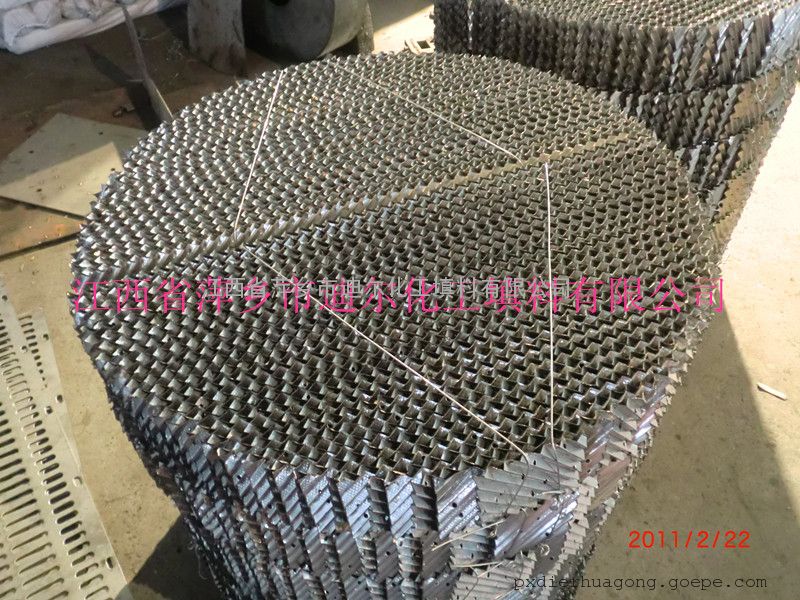 不锈钢波纹板填料:在金属薄板表面冲孔、轧制小纹、大波纹***后组装而成的规整填料,具有阻力小、气液布均匀、效率高、能量大、放大效应不明显等特点,应用于负压、常压和加压操作。