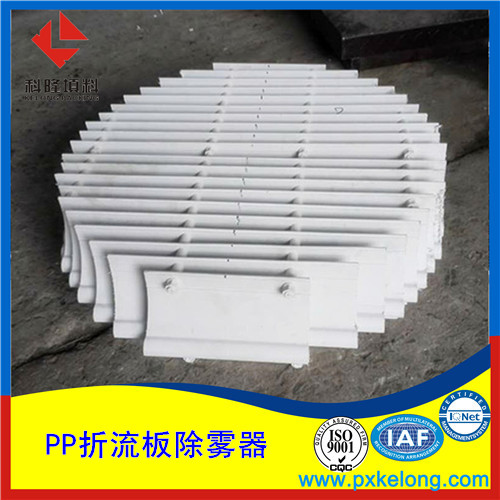 PP折流板除雾器应用原理:当带有液滴的烟气进入除雾器通道时,由于流线的偏折,和气流携带惯性力的作用下实现气液分离,部分液滴撞击在除雾器叶片时被捕集,液滴在除雾器叶片上再不断汇集,到一定程度在自身的重力下回到洗涤池。而残留在除雾器叶片上固体物质在冲洗水作用下也被回收到洗涤池里。如此循环工作除雾器既能起到除雾净化的作用又不会因自身积垢造成阻塞,影响系统正常工作。