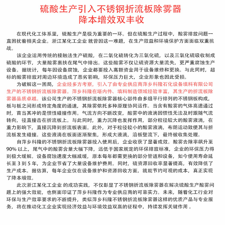 科隆塔内件硫酸生产引入:降本增效双丰收不锈钢折流板除雾器