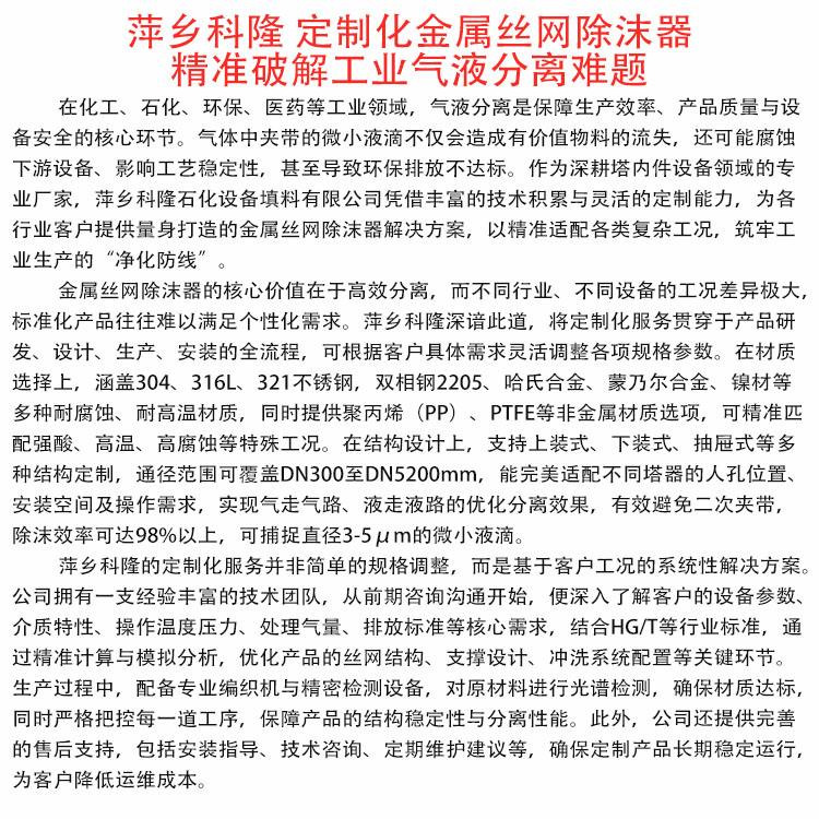 科隆塔内件定制化金属丝网除沫器 精准破解工业气液分离难题SP型