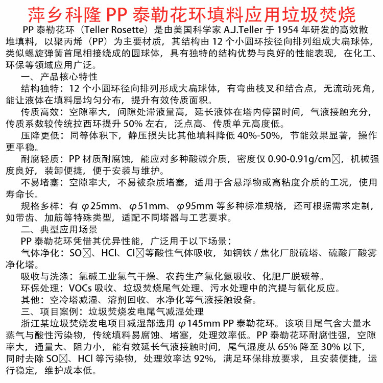 科隆填料PP 泰勒花环应用垃圾焚烧发电尾气减湿处理DN51/73/95
