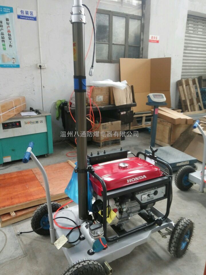 三、产品使用方法:1、将产品推至工作场所放置平稳,并压下两个万向轮的锁扣将轮子锁紧,确保不滚动;2、将升降气缸垂直放置,拧紧手动螺杆;3、将灯盘放入升降气缸***小级轴上,调节好方位后拧紧锁紧螺钉,然后航空插头与灯盘航空插座连接、旋紧,接着将气缸上的电源插头插入发电机上的插座;4、检查发电机负载开关置于OFF档位;5、雨天或潮湿环境下应将发电机接地线可靠接地;