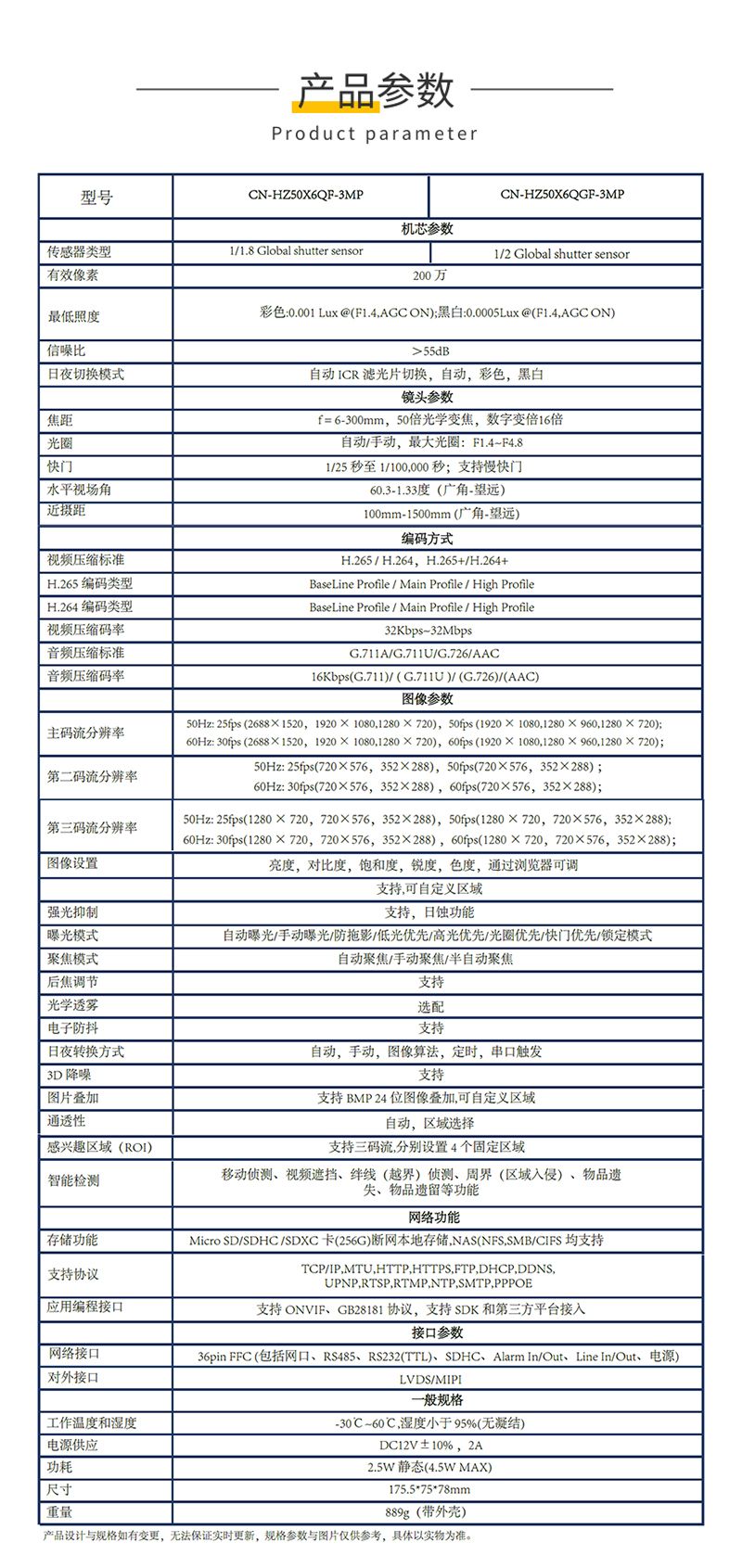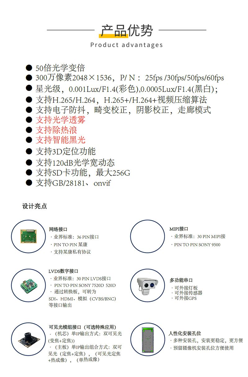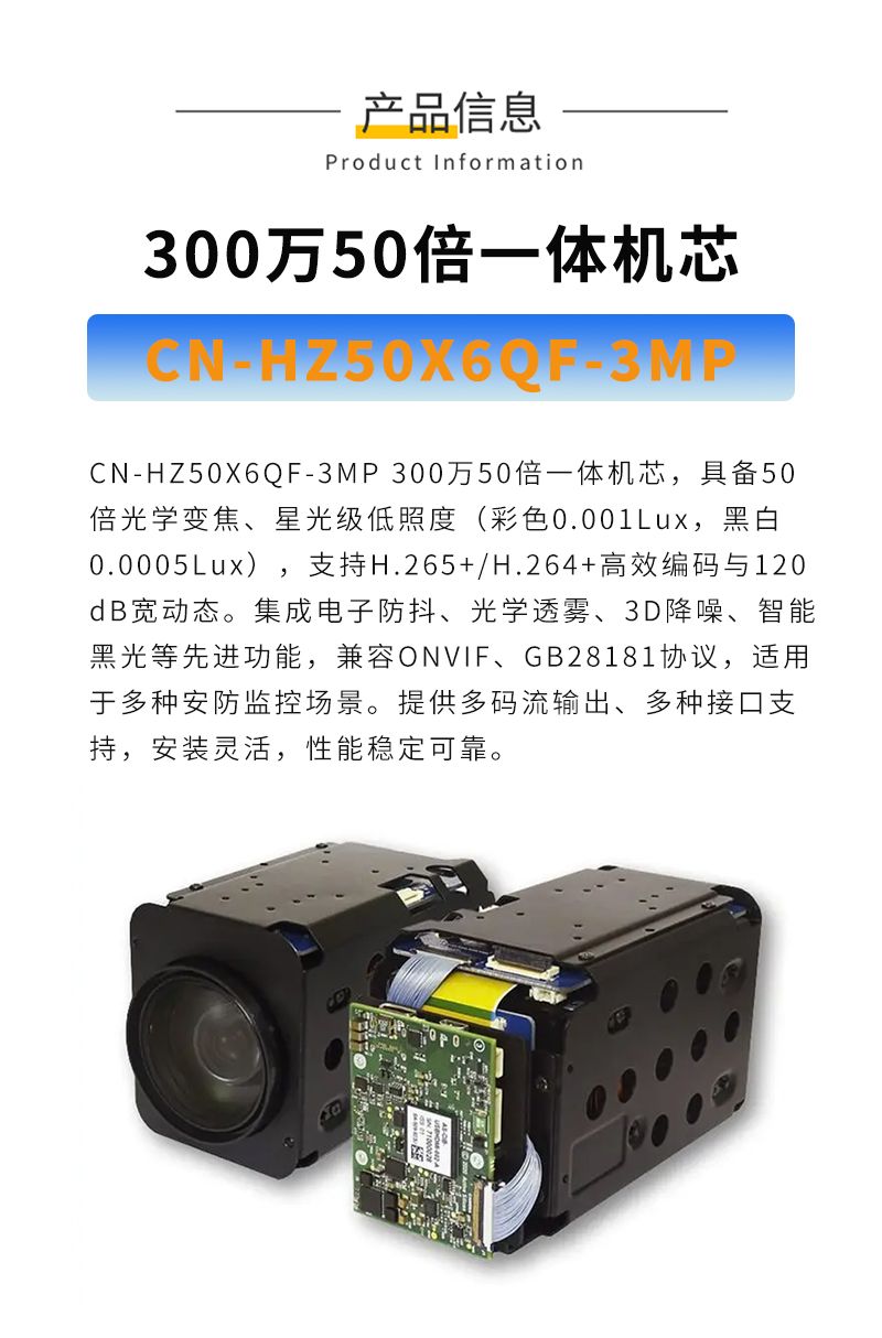 KONFEZI国产300万高清像素 电动变焦50倍一体机芯 6-300mm 星光级低照度CN-HZ50X6QF-3MP