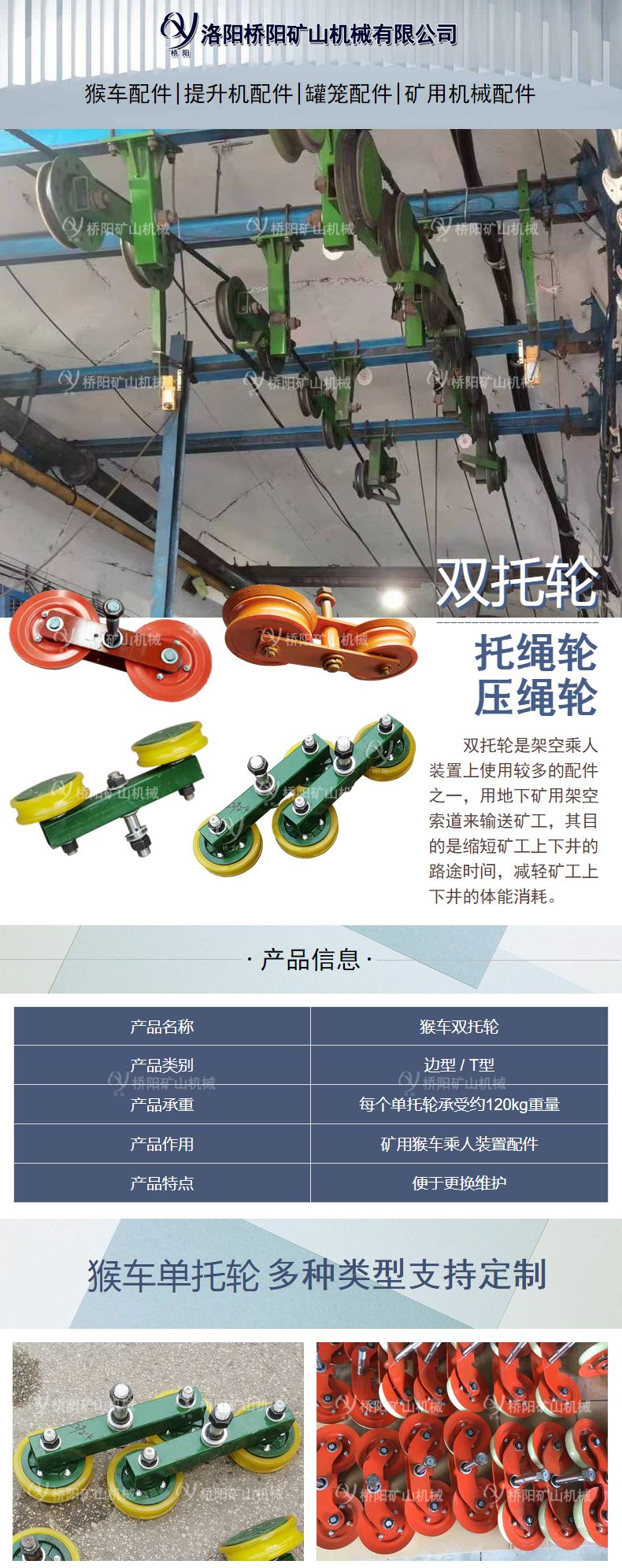 猴车双托轮规格可分为直径180、直径200、直径240三种不同规格,根据钢丝绳大小、抱索器样式及托压轮分布结构进行配比。