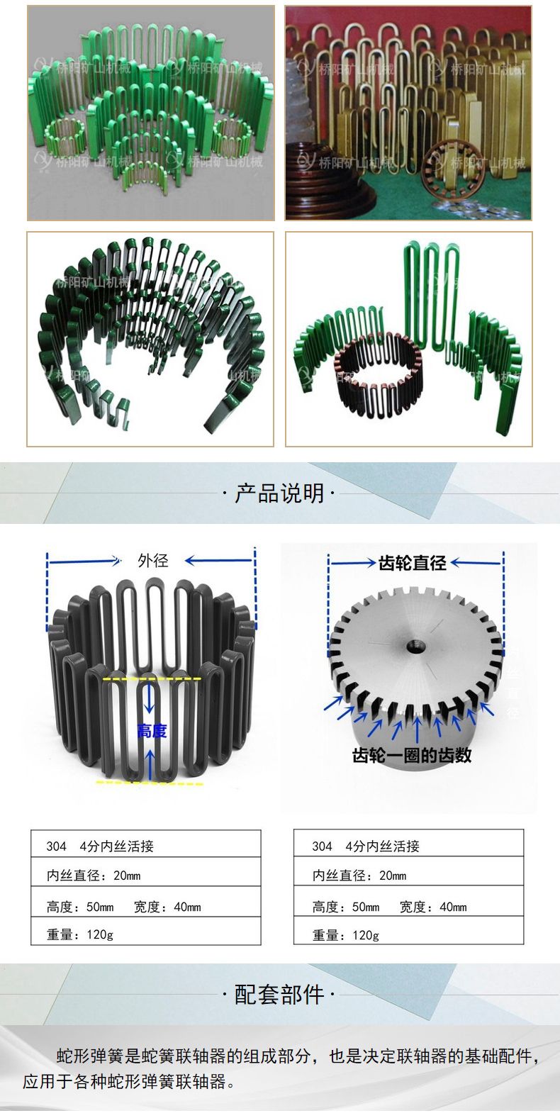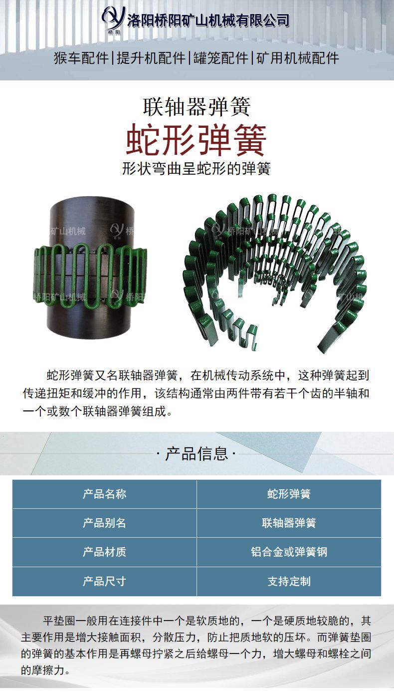 桥阳矿山机械生产的蛇形弹簧联轴器,可以在动力传输系统受到过多的振动与冲击时给予保护。广泛用于冶金、矿山、船舶、水泵、印刷机械等机械传动轴系中传递扭矩,能使传动中的振动冲击。在处理的过程中使弹簧表面形成相应的硬化层并产生应压力,将使弹簧的疲劳周期有所延长。