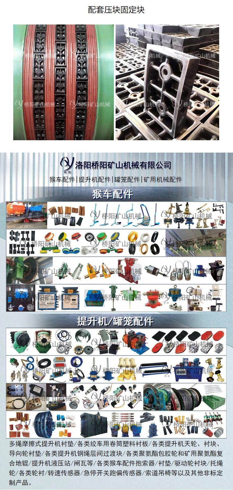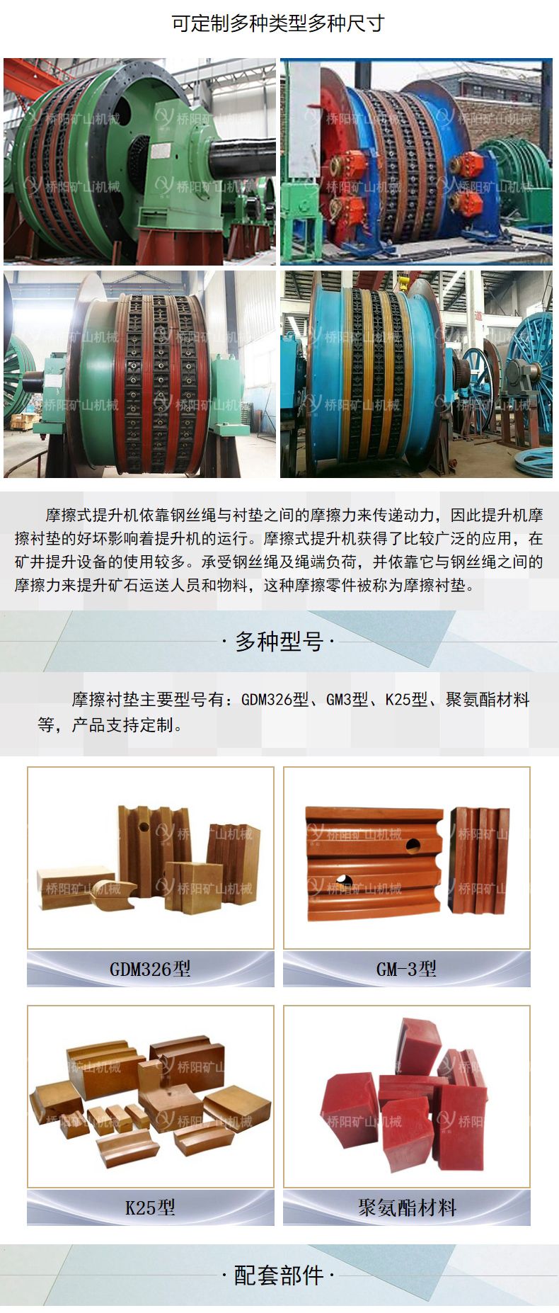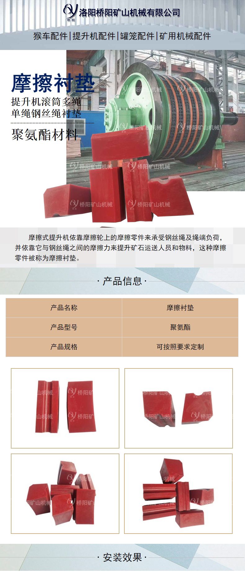 安装于提升机摩擦轮上的摩擦衬垫(简称衬垫),是摩擦式提升机用来驱动钢丝绳、提升载荷的一个比较重要的零件。摩擦式提升机依靠摩擦轮上的摩擦零件来承受钢丝绳及绳端负荷,并依靠它与钢丝绳之间的摩擦力来提升矿石运送人员和物料,这种摩擦零件被称为摩擦衬垫。