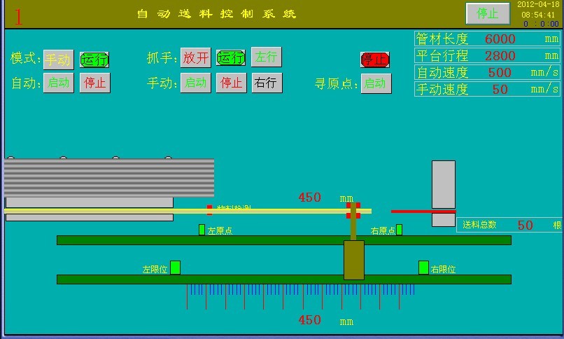 机械手控制系统实现,自动送料的全部过程。 1:精度高,伺服控制送料速度可以达到0.01m/s 2:能适应各种不同尺寸管材,500mm-3000mm均可以使用。 3:无人值守自动送料。 4: 松下伺服系统 5:三菱PLC 6:昆仑通态MCGS触摸屏