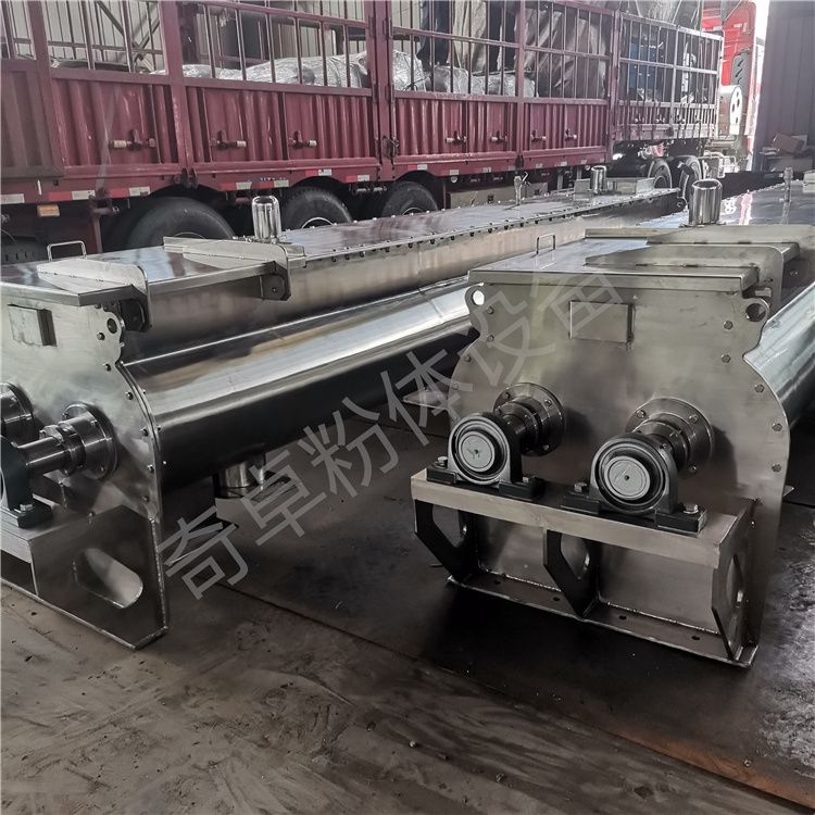 无重力混合机工作原理:卧式双轴桨叶(无重力)混合机由卧式W形容器、带(或者不带)开口的顶盖、安装有桨叶并反向旋转的双轴、传动单元、支撑架、密封件、出料结构等部件组成。由于双轴反向旋转,成一定角度的浆叶将物料沿轴向、径向循环翻搅,使物料达到均匀混合的效果。物料在混合器内的上抛运动形成流动层,产生瞬间失重,所以此系列混合机也叫做无重力混合机。