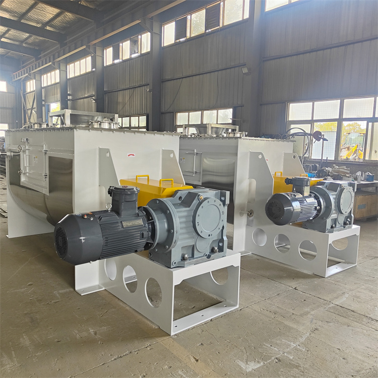 卧式双轴螺带混合机是搅拌干的、粉状的物料,起到搅拌混合均匀的目的。搅拌时机内物料受两个相反方向运动的转子运动,进行着复合运动,双轴桨叶带动物料沿着机槽内壁做顺逆两个时针旋转,靠近轴心处物料做轴心旋转,轴向由内至两侧推动,外螺旋带动靠近筒壁物料做轴心旋转,轴向由两侧至内推动,于是造成物料筒体内对流循环、剪切渗混,完成物料在较短时间内快速均匀混合。