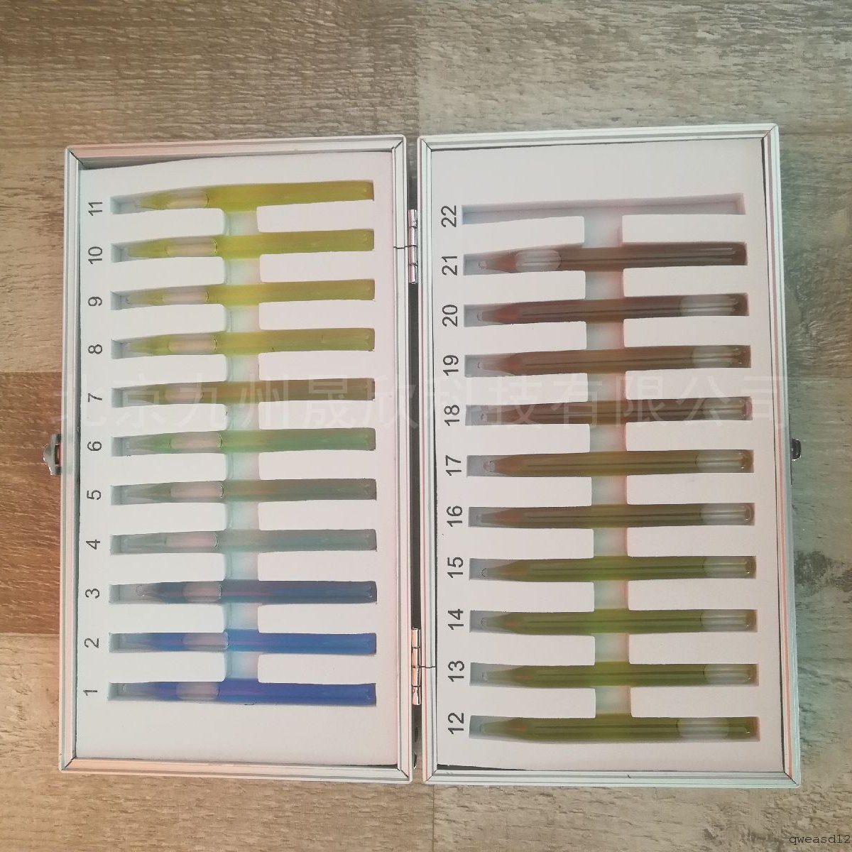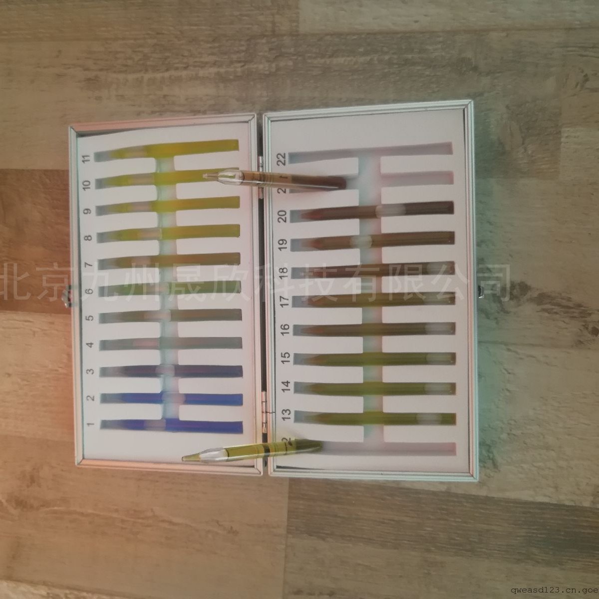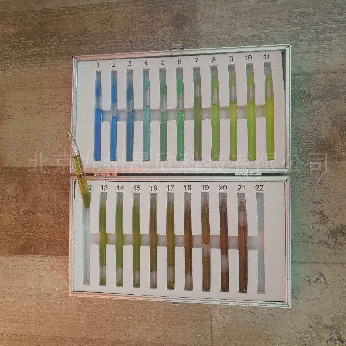 水色计为自然界水色的对照标准品,一共有21/22个标准色,编有号数,可用于对海洋、湖泊、水库等水域现场所呈现的颜色进行比色分级。