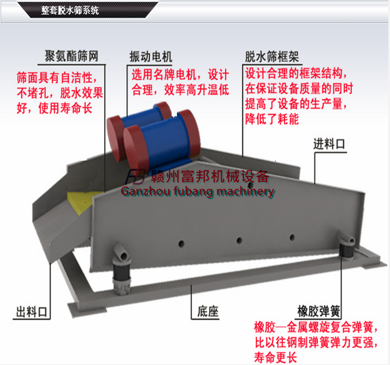 赣州富邦冶金机械公司生产制造的直线脱水筛一种应用于煤炭行业选煤厂的细粒煤脱水的煤泥离析脱水筛,直线脱水筛运动轨迹为直线,是根据JB2444-86《ZSM型煤用座式双轴振动筛》标准生产的,全系列共有十六种规格,可供选煤、选矿、发电、制糖、制盐等工业部门,对中细粒度物料进行干湿式筛分、脱水、脱介、脱泥。