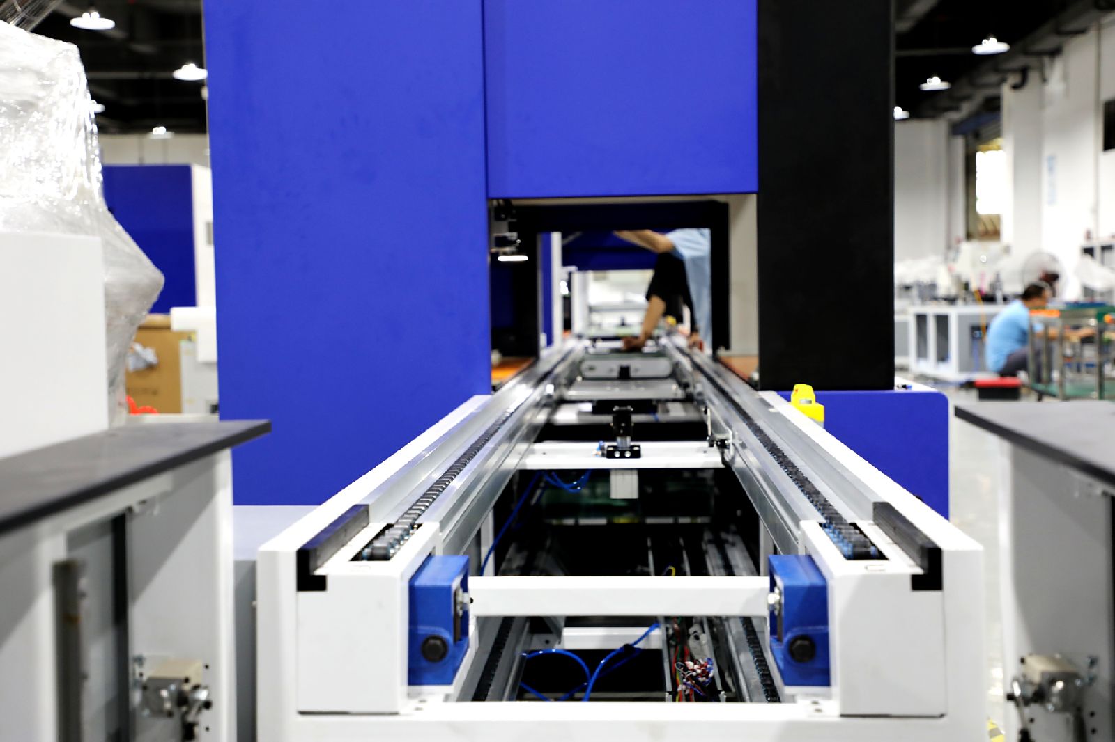 1、工装板舍弃了常用的夹板,改用 20毫米厚的电木板或铝板作为底板,并提供36张数量,底板工艺通常包含蓝色90度导向块以加强承载,加装耐磨条以提高运行时的平稳性。