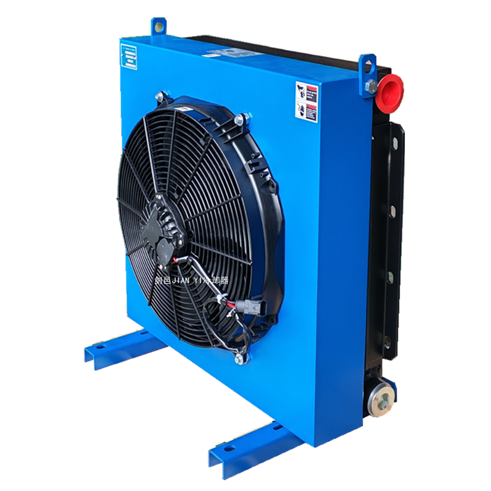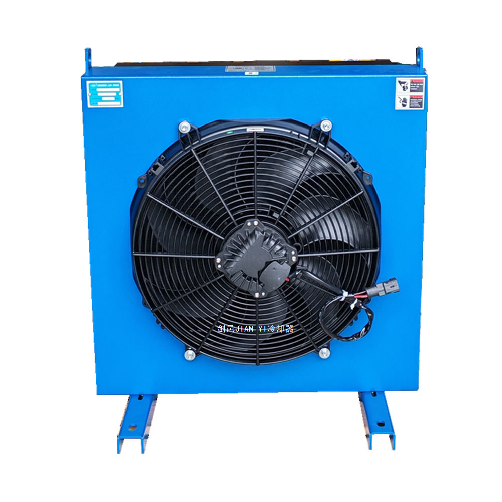 剑邑JIAN YI-ELD系列 工程机械车载型直流电压DC24V_DC12V风冷式液压油散热器冷却器,农业机械玉米收割机液压散热器冷却器_甘蔗收割机液压冷却器散热器,可使用DC12V、24V直流电源驱动、也可以采用液压马达驱动型,散热器配置防尘网能够有效的过滤防止农业机械作业过程中产生的农作物碎渣和其他灰尘杂物吸入堵塞散热器外传热翅片而影响散热效果(请注意务必每个工作日都清理一次防尘网上的杂物,保证通风不受影响,如果工作量大,防尘网堵塞严重必须马上清理,否则会严重影响散热效果),散热器还可以配置安装旁通安全泄压阀,防止机械设备液压系统回油流量冲击压力大而造成散热器损坏漏油。