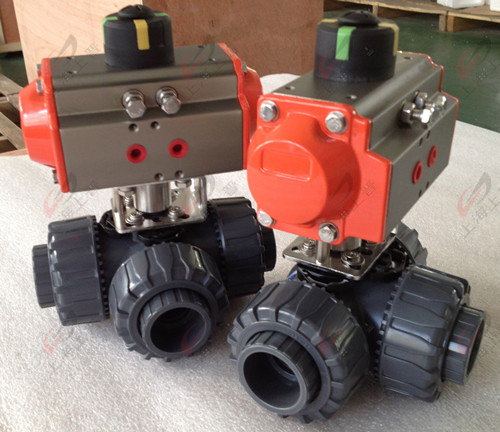 UPVC气动三通球阀 耐腐蚀分L型和T型,气动执行器带动球体经90度的旋转动作来达到换向的控制目的,或经180度的旋转动作来达到换向与分流合流的控制目的。执行器与阀体的直接连接减少了发生故障的机率。法兰连接的管路能保持良好密封性能,便于维修更换,便于管路的封闭。