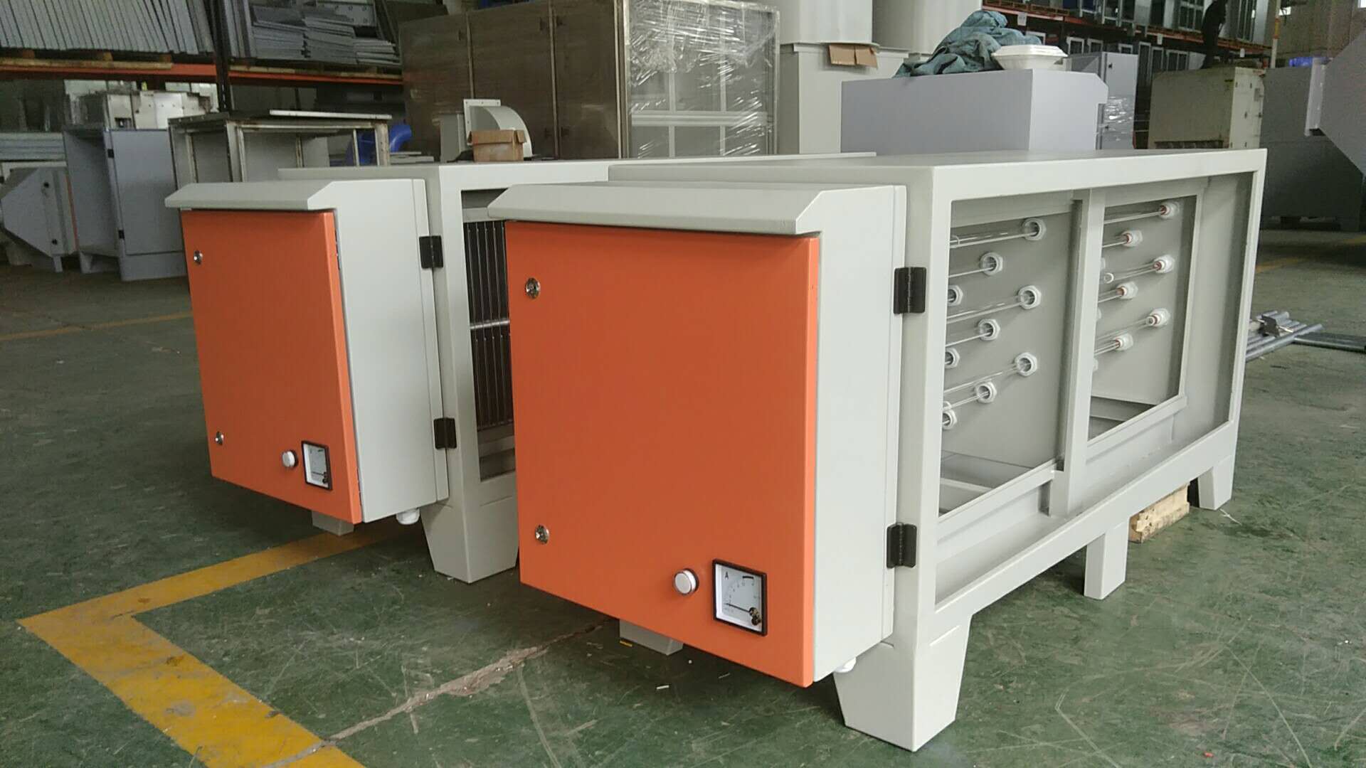 前置过滤器通过机械作用将大颗粒油滴在自身重力的作用下流入油槽排出。剩余的小粒径污染物进入次级装置——高压静电场,静电场内部分两级,前一级为电离器,强电场使微粒荷电,成为带电微粒,这些带电微粒到达第二级集尘器后立刻被收集电极吸附,回流到专用集油盆。洁净的空气排出室外。
