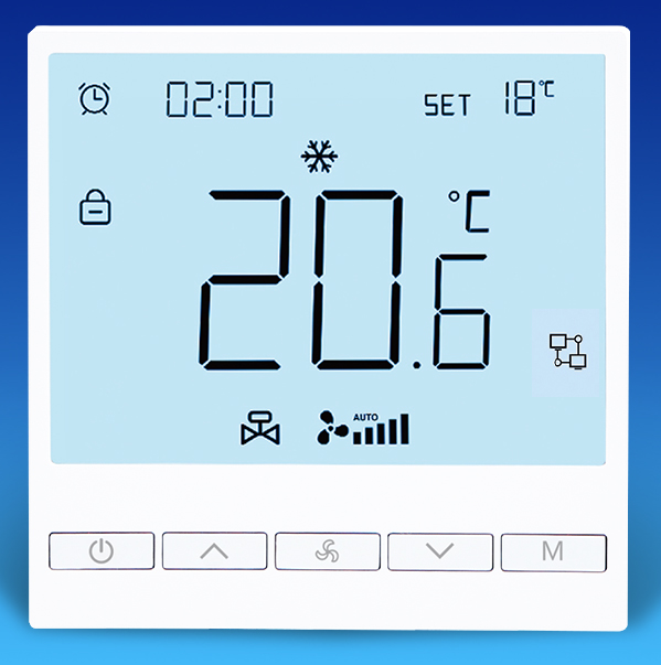 温控器是一款中央空调直流风机盘管温控器,可通过键盘操作实现定时开关机,模式切换、风速调整、 锁定、恒温温度设定等操作。