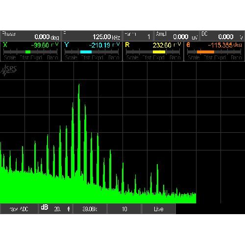 传统锁相放大器属于时域测量仪器,但在部分应用场景下,从频域角度分析信号会更易理解。SR860 可同时胜任时域和频域测量任务,其 FFT 频谱显示功能支持查看三种信号的频谱:前端输入信号、混频后信号以及经时间常数滤波器滤波后的信号。借助 FFT 频谱显示功能,用户能够轻松定位那些在传统锁相放大器 “单一数值” 输出结果中难以察觉的隐性噪声源。