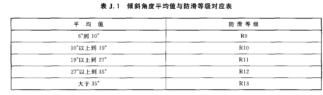 根据角度范围而划分的防滑等级如表J.1所示: