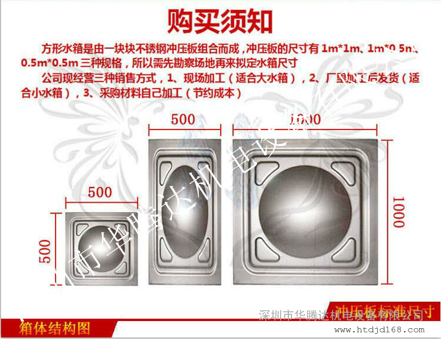 深圳市华腾机电设备有限公司是一家从事各种规格的不锈钢水箱研发、生产、安装及拥有完善的销后服务的深圳不锈钢生活水箱厂家,公司有一支精良的安装队伍,现有的工程技术人员数十名,保证产品的质量,为客户提供全方位的优质服务,我们产品行销全国各地以及港澳等地区。提供香港,澳门地区不锈钢水箱,玻璃钢水箱制作安装服务(我们工程技术人员已办有港奥技工劳务施工证),华腾达水箱规格可以根据客户所需要的规格来制定,大小规格1立方,10立方,100立方,200立方,500立方,1000立方,2000立方,任意组合,大小规格型号可以根据客户的要求定制生产安装,欢迎来电咨询,厂家直销,价格优惠,服务满意!