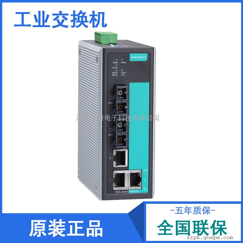 EDS-405A 系列专为工业应用而设计。这款交换机配备各种实用的管理功能,例如:Turbo Ring、Turbo Chain、环网耦合、IGMP Snooping、IEEE 802.1Q VLAN、基于端口的 VLAN、QoS、RMON、带宽管理、端口镜像,以及通过电子邮件或继电器发出警告。使用 Web 管理界面或 EDS-405A 交换机顶部面板上的 DIP 开关,即可轻松设置 Turbo Ring。