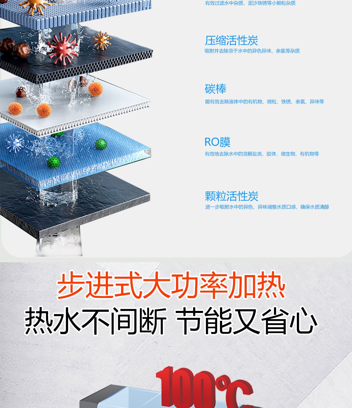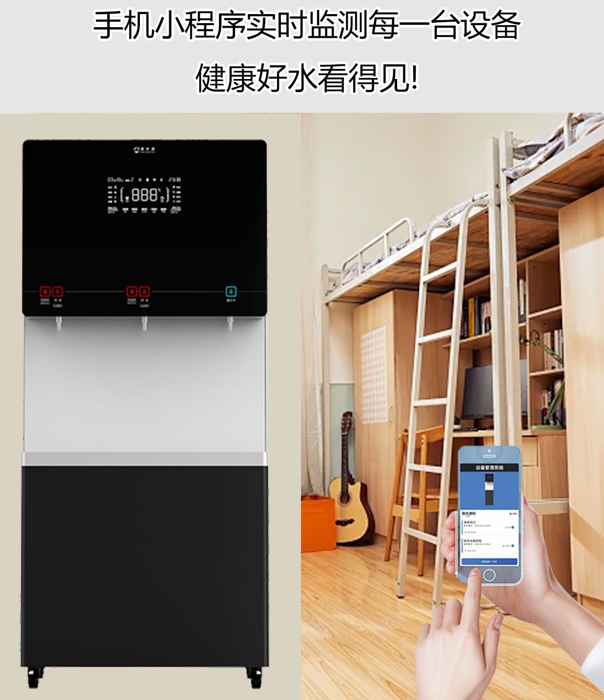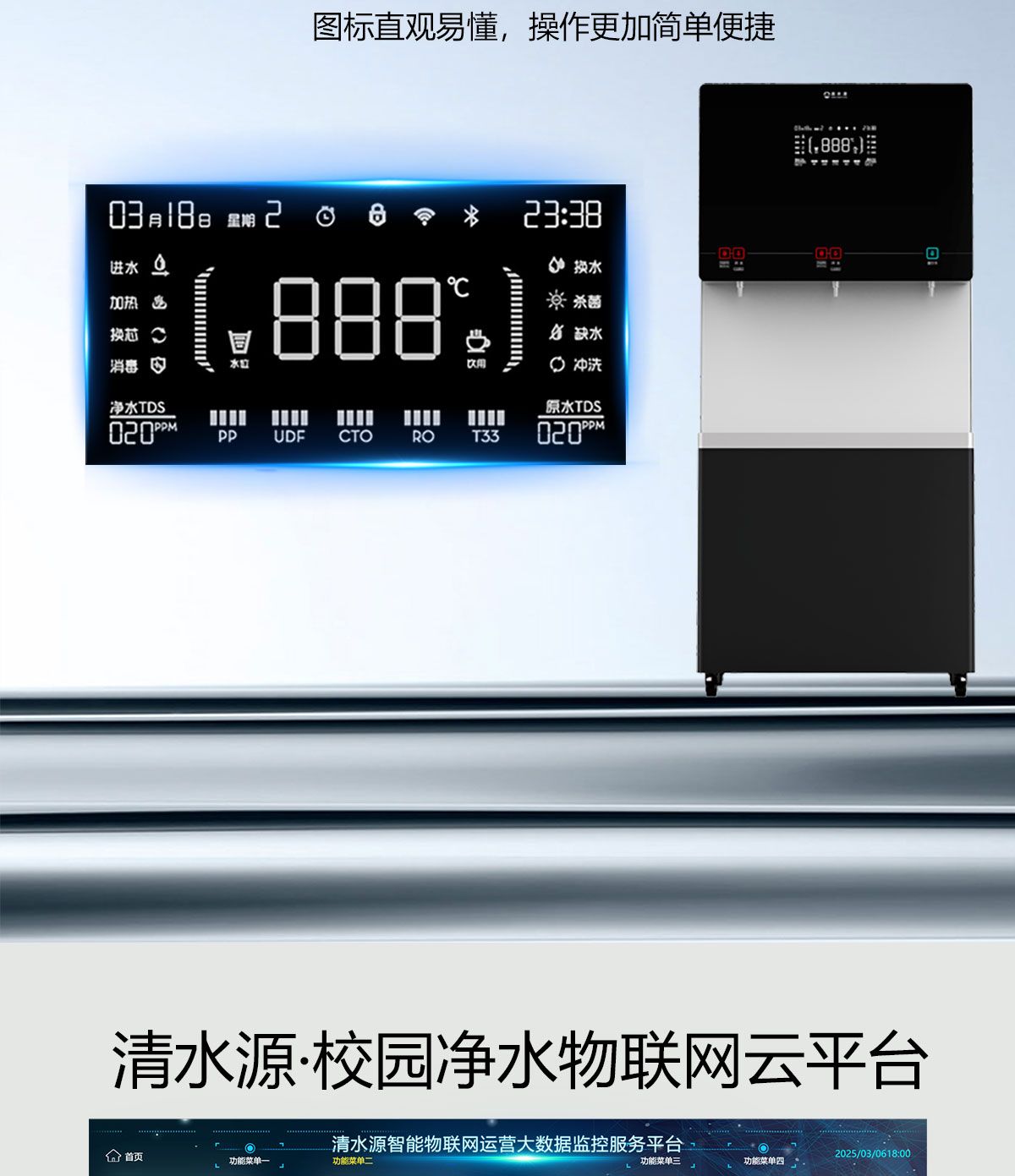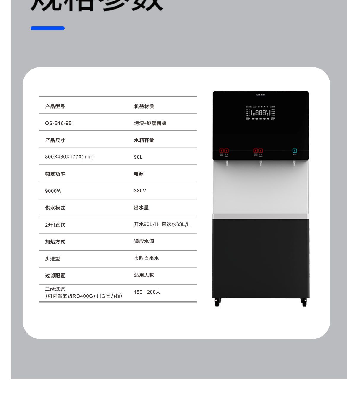 产品尺寸800*480*1770mm,出水量开水90L/H直饮水63L/H,电压380V,功率9kw,可供应150-200人。清水源品牌二开一直饮步进式直饮机,水箱容量90L,该容量水箱可供应200人饮用。可选择配备3级普通过滤。 五级反渗透过滤功能,显示触屏功能配合远程开关及定时功能,使得用户使用感提升,性价比更高。 配有UVLED杀菌水嘴,严防守住*后一道防线,使得水质更加的安全,用户更安心。 。具有100%煮开、高温杀菌系统,确保水质健康、检测无忧。定时开关机、隔夜水定时自动排空、物联网自动报修、水质实时监测、滤芯消耗更新显示、手机远程开关机等特点。零售价为16380元/台。