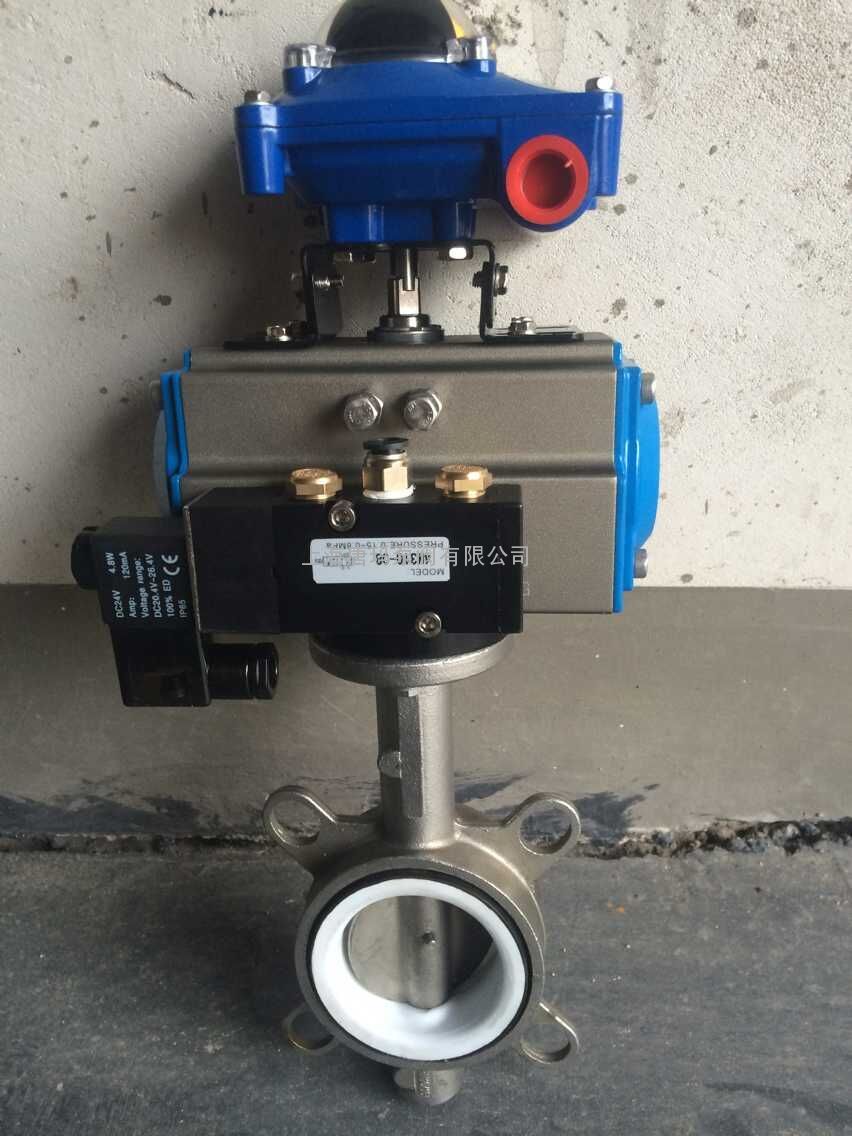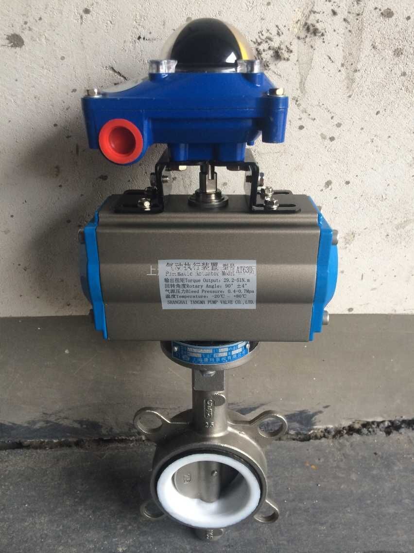 D671F四氟密封气动对夹式蝶阀采用带有球形密封表面的衬氟塑料包衬蝶板或不锈钢板,配以阀座基部的硅橡胶衬垫调节阀门的密封性能;该阀门操作轻便,严密的密封性能,超长的使用寿命;可作快速切断或调节流量之用。适用于要求可靠密封和良好调节特性的场合。阀体采用分体式,阀轴现端的密封由蝶板与阀座之间的旋转基面加氟橡胶来控制, 从而达到产品结构紧凑、外形美观、工艺合理、性能可靠。保证阀轴不与腔内流体介质接触,更换阀轴时非常方便,阀门不需要拆离离管道即可完成。产品广泛适用于各种不同类型工业管道中液体和气体(包括蒸气)的输送,特别是具有严惩腐蚀性介质的使用场合如硫酸、氢氟酸、磷、酸、氯气、强碱,王水等具有强腐蚀的介质。