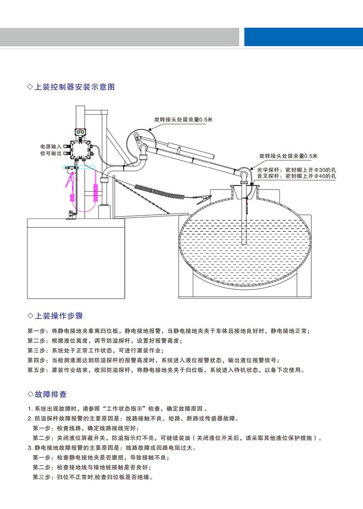槽罐车装卸车顶装防静电溢油保护器是一种专门用于易燃易爆场所的安全防护设备,通过实时监测液位和静电接地状况,在出现异常时发出声光报警并输出联动信号,确保装卸作业安全。