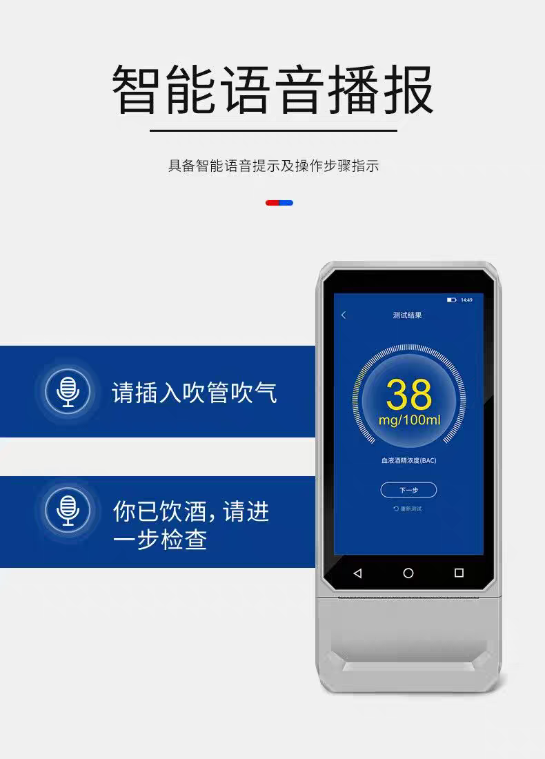 4. 结果读取:检测完成后,屏幕显示酒精浓度数值,同时语音播报结果