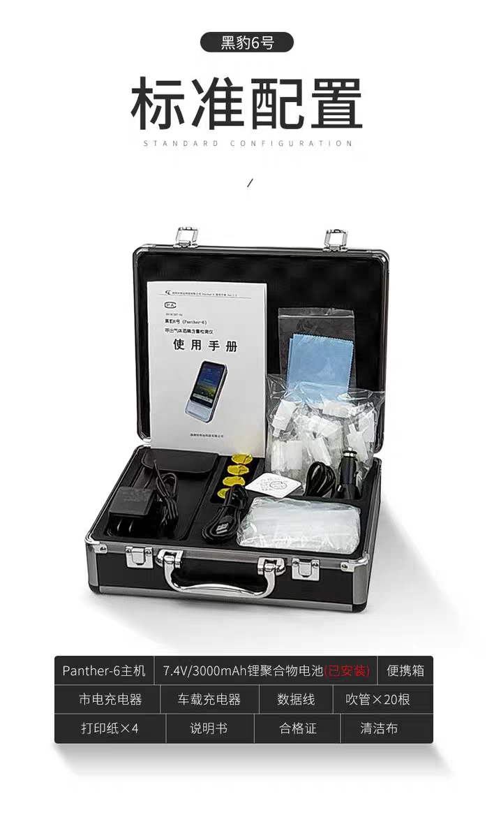 黑豹6号(Panther-6)是一款呼出气体酒精含量检测仪,主要应用于交通、安保检查等场景。以下是该设备的核心信息: