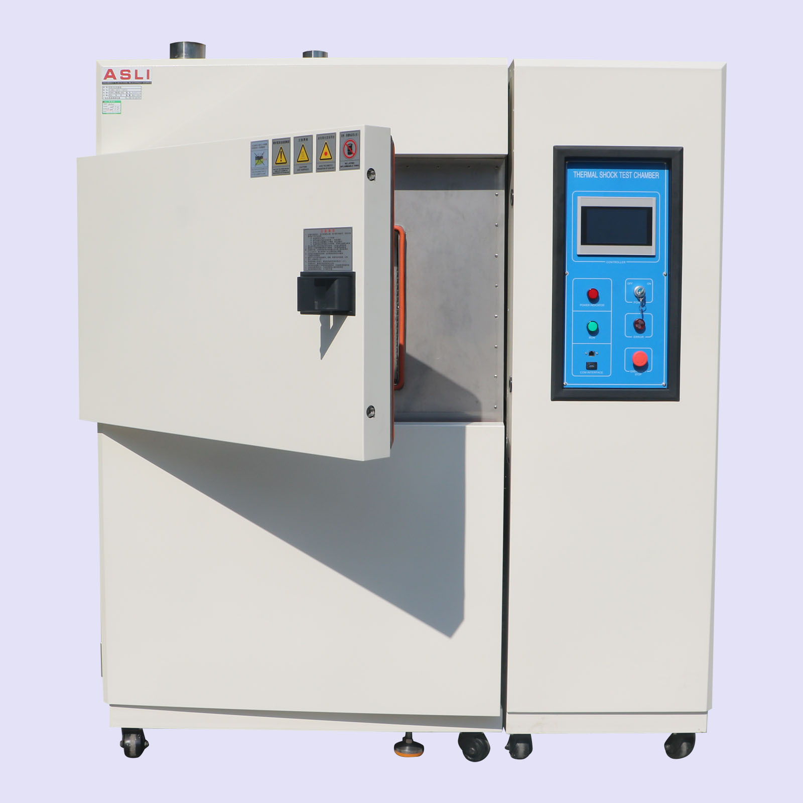 艾思荔生产的三箱式冷热冲击试验箱控制为进口数显仪表,具有程序编写和控制\PID自动跟踪检索整定功能。箱体采用数控机床加工成型,造型美观大方,并采用无反作用把手,操作简便。箱体内胆采用进口不锈钢板和镜面板,箱体外壳采用A3钢板喷塑,增加了外观质感和洁净度。