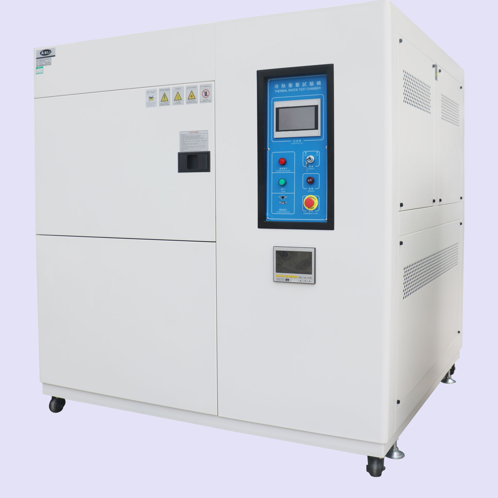 艾思荔生产的小型冷热冲击试验箱公司控制为进口数显仪表,具有程序编写和控制\PID自动跟踪检索整定功能。箱体采用数控机床加工成型,造型美观大方,并采用无反作用把手,操作简便。箱体内胆采用进口不锈钢板和镜面板,箱体外壳采用A3钢板喷塑,增加了外观质感和洁净度。