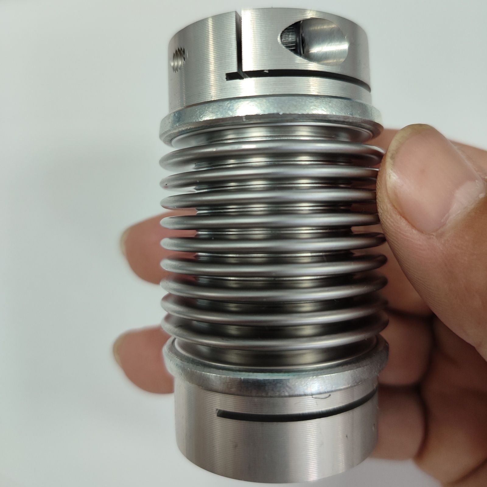 - 波纹管联轴器:由两端的金属轮毂和中间的不锈钢波纹管组成。波纹管具有良好的柔性和扭转刚度,能灵活地适应轴的偏移,同时保证扭矩的高效传递。在结构设计上,波纹管部分较为细长,两端轮毂直径根据所连接的轴径精准适配。常用于对运动精度和稳定性要求苛刻的领域,如半导体制造设备、光学仪器的精密传动系统,可实现出色的位置反馈,确保设备运行的高精准度 。