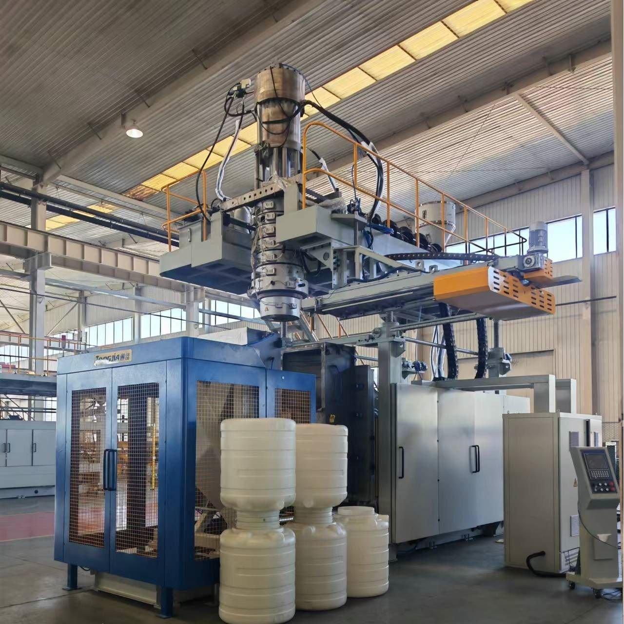 大型中空吹塑机主要用于生产化粪池、浮桶、油箱、塑料托盘、交通设施等; TJ-KB2000L中空吹塑机采用日本油研主阀、意大利杰弗伦壁厚控制系统、液压驱动采用伺服电机控制,电机电器。因采用了国际一流配置,从而保证了制品精密度和设备稳定性。