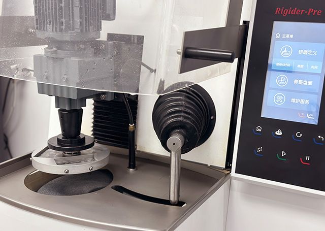 -Rigider-Pre带自动金刚石笔修整器,确保磨石的平整且锋利,自动修平磨石可在程序上设置修整间隔时间和频率,并可设置修平厚度。当磨石的剩余厚度低于预期设置值时,系统会提示用户更换磨石。