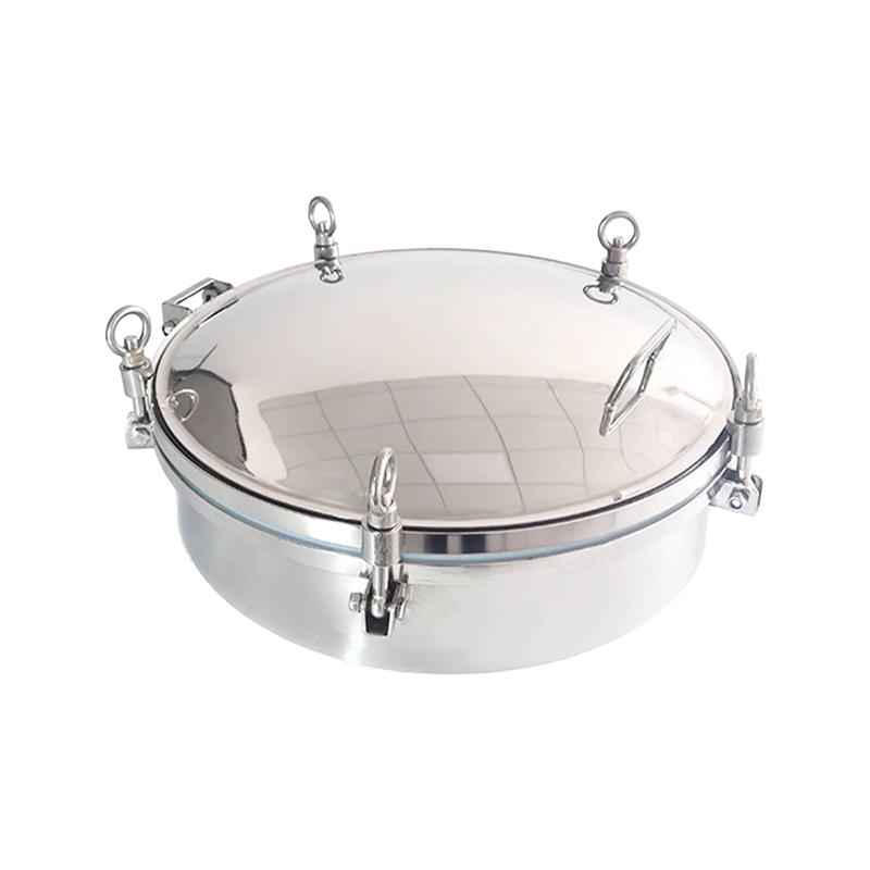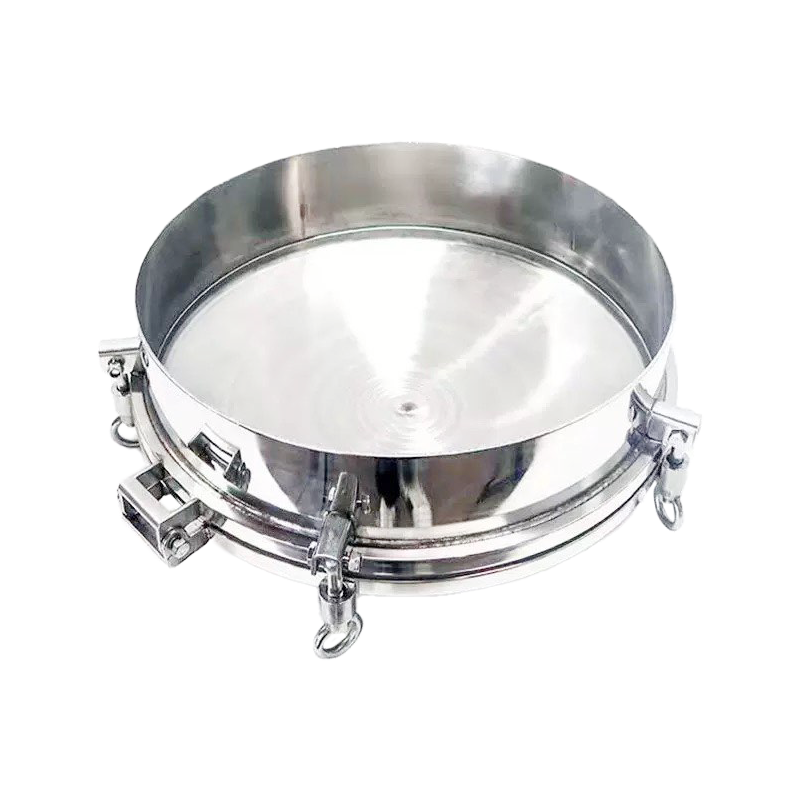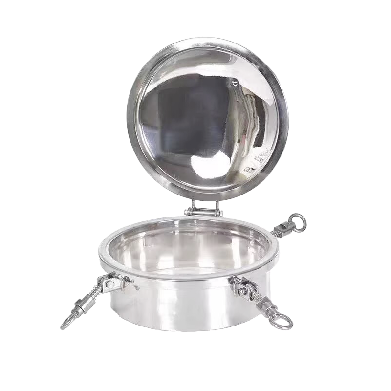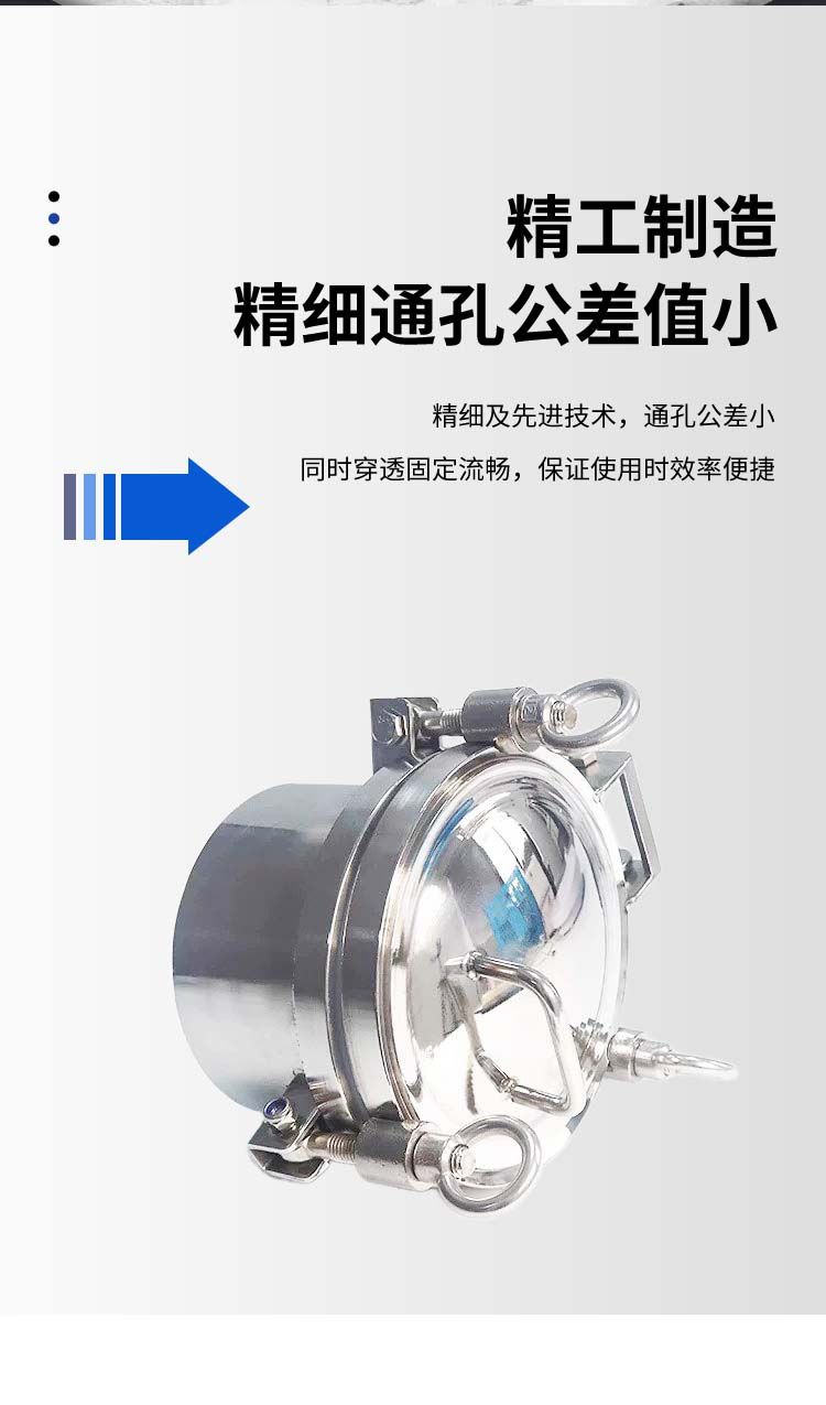 不锈钢压力人孔采用SUS304,316L制作,可以满足食品,生物制药领域各种介质的特殊要求,其光滑,无缝,自动排空手工艺流体通道还非常适用于蒸汽踏它就地清洗的需要,在制造加工过程中严格按FDA要求进行质量临控,采用电脑三维设计,是GMP要求而制造的内开人孔。