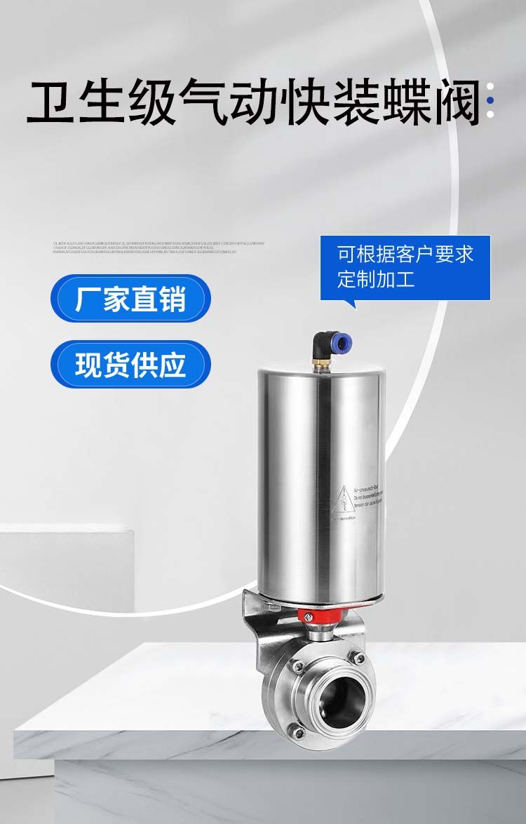 不锈钢气动快装蝶阀是一种卫生型经济开/关阀门,可用于自动系统或手动系统。由于开口面积大,对流体阻力小,并且中低粘度性的产品有比较柔和的处理,使其成为现代加工技术的主要解决方案。该阀用于食品、奶制品和酿造系统以及生物制药应用。