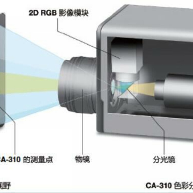 柯尼卡美能达与Instrument Systems运用各自在显示器检测领域的技术经验和研发实力,携手开发出新一代的图像色彩分析仪,为平板显示生产线提供快速、精确、简易的亮度与色度检测方案。结合运用RGB CMOS影像传感器和CA-310 色彩分析仪传感器两个模块,由CA-310模块测量高精度三刺激值作为基准值,用于校正2D图像里每个像素的数值,保证整幅图像数据的准确性。此外,仪器还集成有分光镜,让影像传感器和色彩分析仪传感器同步测量成为可能。图1展示了LumiCol 1900的设计理念。