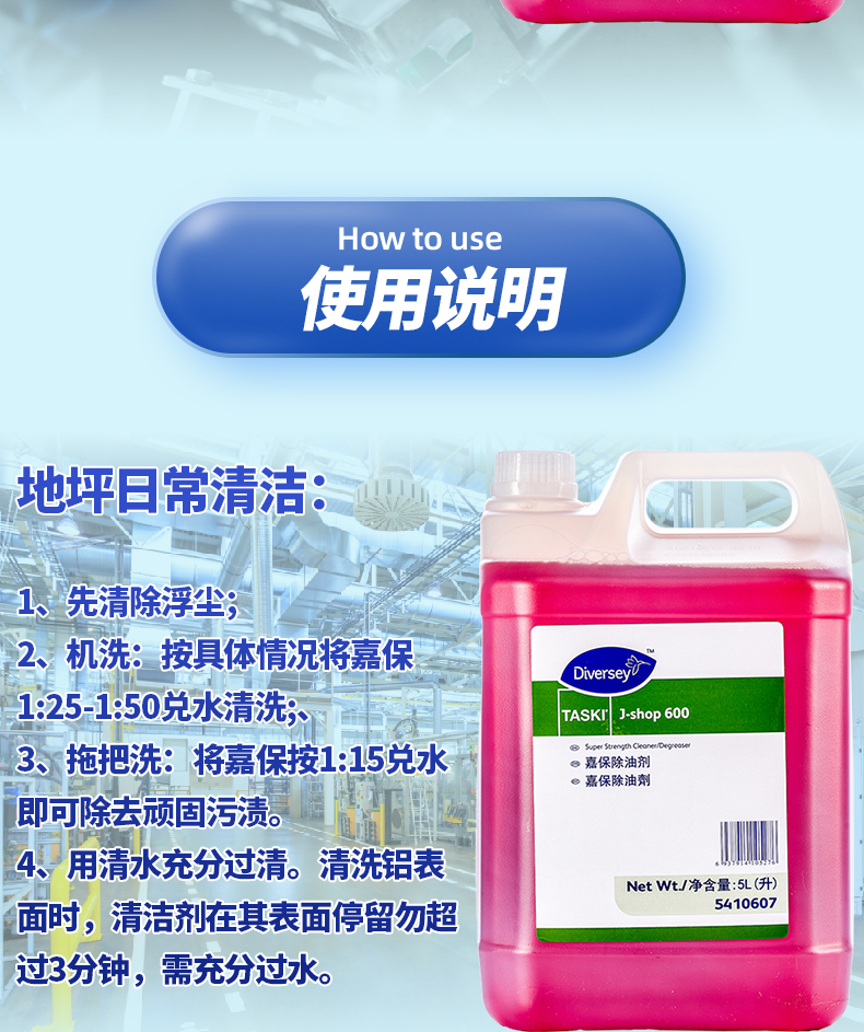 适用于厂房地坪、墙面、铸铁、不锈钢等各种可水洗表面的油污清洗。玻璃和铝质表面慎用。