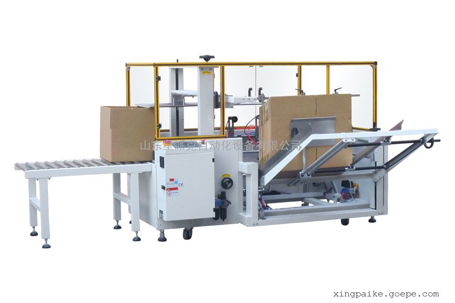自动完成开箱、成形、下底折叶折曲.并现时完成下部分胶带粘贴,将叠成纸板的箱板自动打开,箱子底部按一定程序折合,并用胶带密封后输送给装箱机的专用设备。自动开箱机是大批量纸箱自动开箱、自动折合下盖、自动密封下底胶带的流水线设备,本机采用P.L.C+显示屏控制,大大方便操作、管理、减少生产人员和劳动强度,是自动化规模生产必不可少的设备。操作方便,降低包装成本。