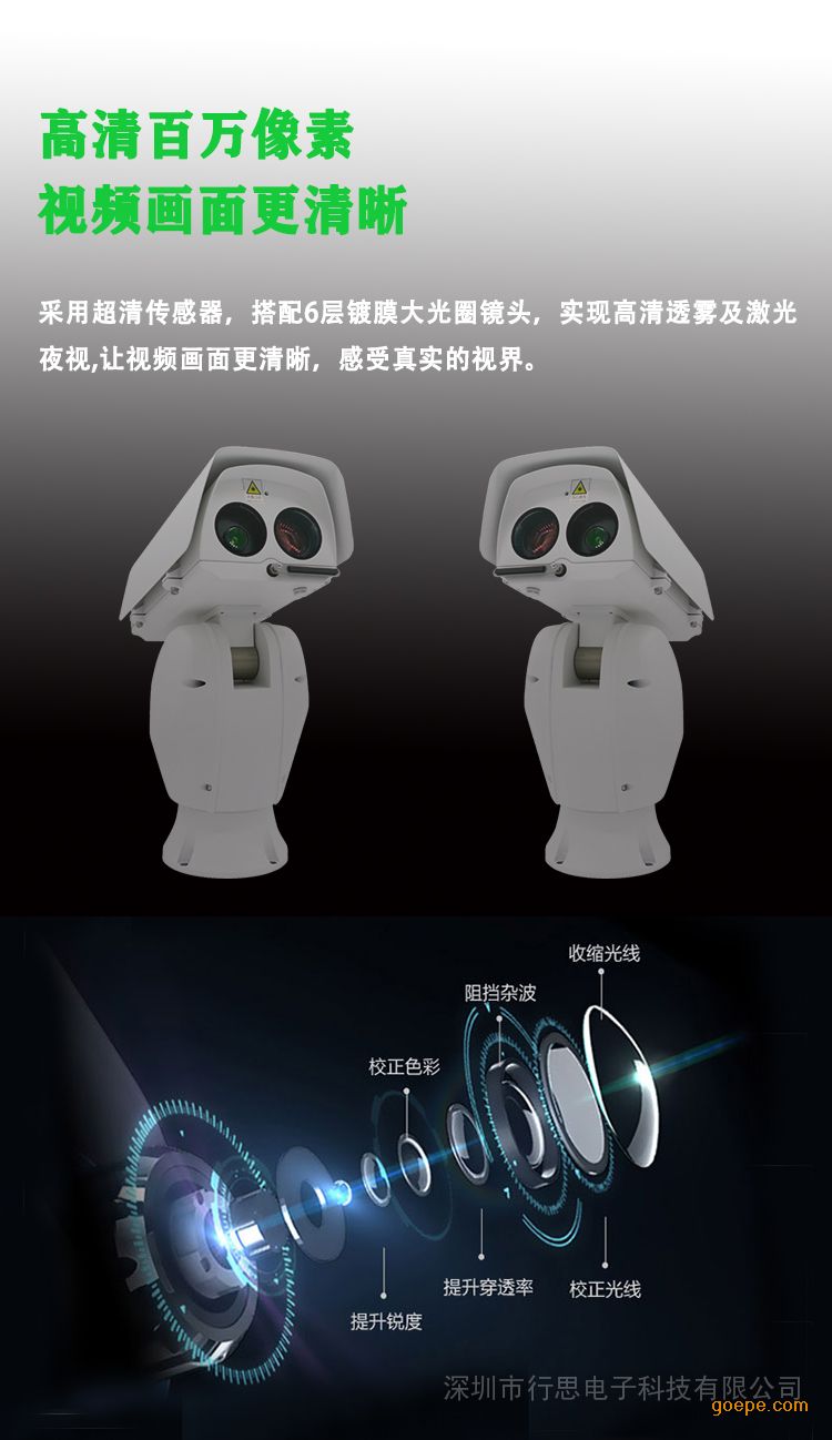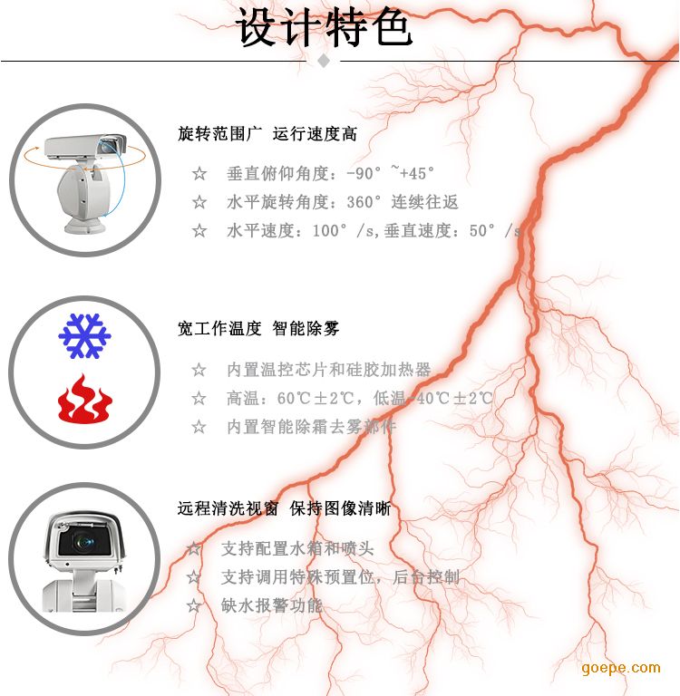 | 防护罩 | 材质 | 铝合金外壳,全封闭设计,一体化双视窗设计,带雨刷 | |||