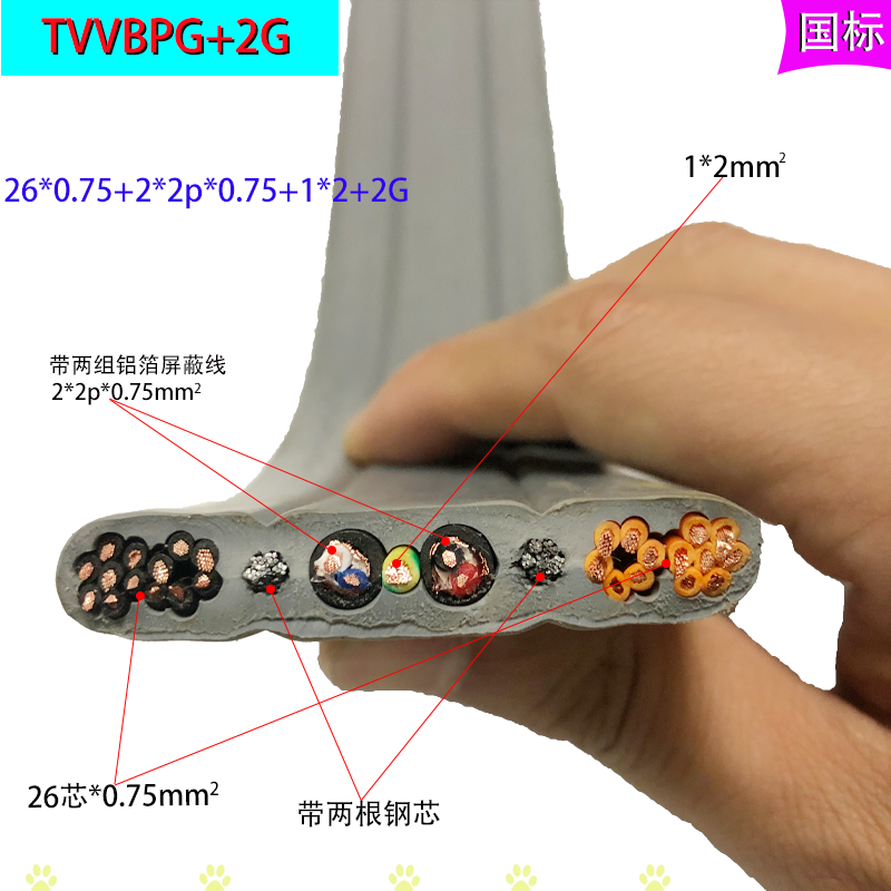 TVVBPG 随行扁平电缆是一种应用于特定场景的特殊电缆,以下是关于它的详细介绍: 1. 用途: - 适用于交流额定电压 300/500V(或 450/750V)及以下的电梯、行车和升降机械设备等。具有集动力传输、控制、通讯、摄像监控等多种功能于一体的特性,能满足这些设备在运行过程中的多种电气需求。 - 常用于需要电缆随设备移动、频繁弯曲且对信号传输有一定要求的场合,例如电梯的轿厢与电梯井道之间的连接,行车等起重设备的电气连接等。 2. 使用特性: - 温度要求:电缆导体的长期允许工作温度不超过 70℃,敷设环境温度应不低于 0℃,这确保了电缆在正常工作环境下的稳定性和安全性。 - 悬挂长度和移动速度:安装自由悬挂长度通常不超过 80m,移动速度不超过 4m/s。如果超出这些范围,可能需要特殊的结构设计或增加承力元件来保证电缆的正常使用。 - 弯曲半径:电缆敷设安装允许弯曲半径应不小于电缆小边的 6 倍,这使得电缆能够适应设备的频繁移动和弯曲,不易损坏。 3. 结构组成: - 导体:采用多股超细精绞无氧铜丝,符合相关标准,具有良好的导电性和柔韧性。 - 绝缘:使用特殊混合 PVC 绝缘材料,能够保证电缆的绝缘性能,防止电流泄漏和短路等问题。 - 屏蔽层:具有屏蔽结构,可有效抵抗外界的电磁干扰,保证信号传输的稳定性和准确性。屏蔽方式通常有铝箔绕包屏蔽、铜网编织屏蔽等。 - 加强件:部分 TVVBPG 随行扁平电缆会配备镀锌航空钢丝等加强件,以增加电缆的抗拉强度和承载能力,使其能够在长距离悬挂或承受较大机械应力的情况下使用。 - 护套:一般采用耐寒 PVC 专用护套,颜色通常为灰色或黑色,具有良好的耐磨性、耐寒性和耐腐蚀性,能够保护电缆内部结构不受外界环境的影响。 4. 产品优势: - 散热性好:扁平的形状使得电缆与空气的接触面积较大,有利于热量的散发,能够在一定程度上降低电缆因发热而产生的故障风险。 - 弯曲性能佳:相比圆形电缆,TVVBPG 随行扁平电缆更容易弯曲,且弯曲半径较小,能够适应设备在狭小空间内的安装和使用要求。 - 便于布线和安装:扁平的外形使得电缆在布线时更加整齐、美观,并且可以更好地贴合设备的表面,减少占用空间,方便安装和维护。