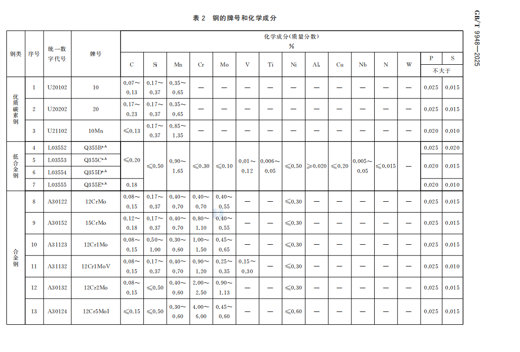 GB/T9948-2025无缝钢管化学成分: