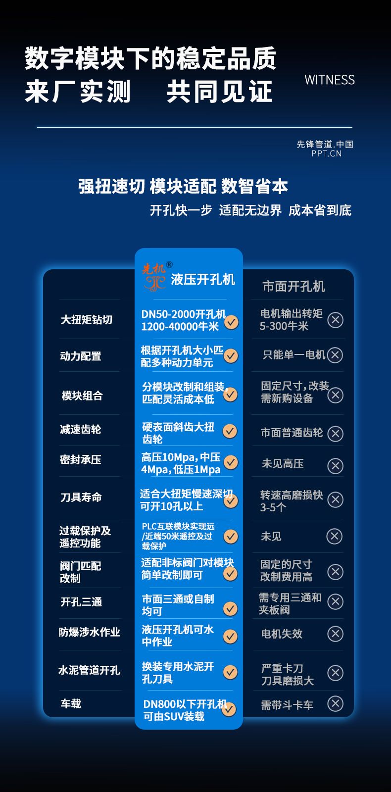 1.带压开孔机主要用于自来水、热力、冷却水、煤气、石油、化工等各种规格主管道的嫁接 分支管道作业。 The pressurized drilling machine is mainly used for grafting branch pipelines of various specifications of main pipelines such as tap water, heat, cooling water, gas, petroleum, chemical, etc.