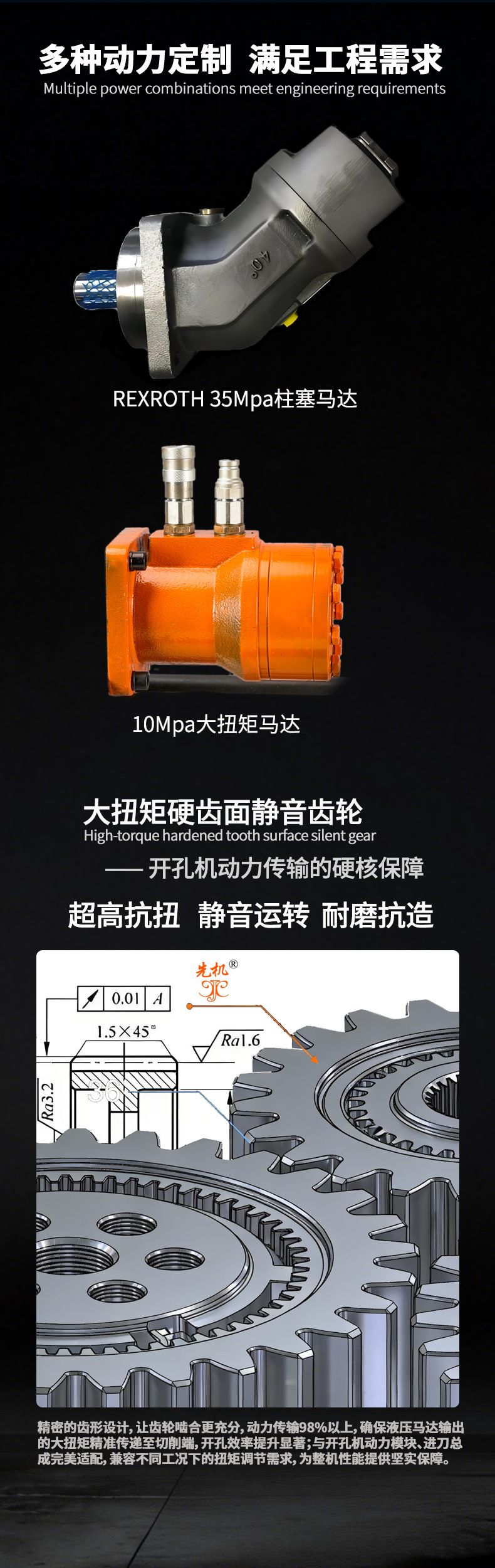 8.液压马达排量、标准额定工作压力以及输出扭矩、转数等参数依据开孔钻所需动力不同而有所 改变。