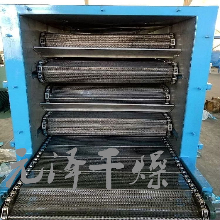 物料由加料器均匀地铺在网带上,网带一般采用12-60目不锈钢丝网,由传动装置拖动在干燥机内移动。干燥机由若干单元组成,每一单元热风独立循环,部分尾气由专门排湿风机排出,废气由调节阀控制,热气由下往上或由上往下穿过铺满物料的网带完成热量与质量传递的进程,带走物料水份。网带缓慢移动,运行速度可根据物料温度自由调节,干燥后的成品连续落入收料器中。上下循环单元根据用户需要可灵活配备,单元数量亦可根据需要选取。
