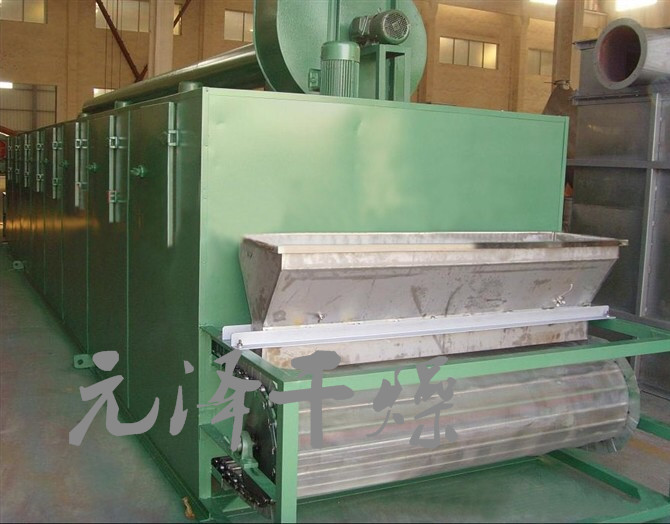 物料由加料器均匀地铺在网带上,网带一般采用12-60目不锈钢丝网,由传动装置拖动在干燥机内移动。干燥机由若干单元组成,每一单元热风独立循环,部分尾气由专门排湿风机排出,废气由调节阀控制,热气由下往上或由上往下穿过铺满物料的网带完成热量与质量传递的进程,带走物料水份。网带缓慢移动,运行速度可根据物料温度自由调节,干燥后的成品连续落入收料器中。上下循环单元根据用户需要可灵活配备,单元数量亦可根据需要选取。