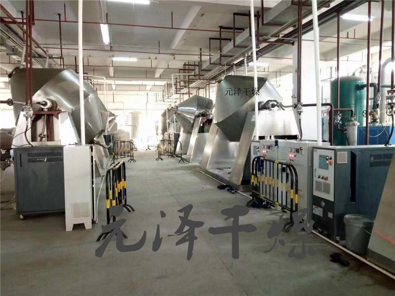 双锥回转真空干燥机系统主要由双锥回转真空干燥机、冷凝器、除尘器、真空抽气系统、加热系统、冷却系统、电控系统等组成。