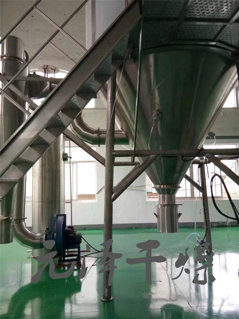 空气经过滤和加热,进入干燥器顶部空气分配器,热空气呈螺旋状均匀地进入干燥室。料液经塔体顶部的高速离心雾化器,(旋转)喷雾成极细微的雾状液珠,与热空气并流接触在极短的时间内可干燥为成品。成品连续地由干燥塔底部和旋风分离器中输出,废气由风